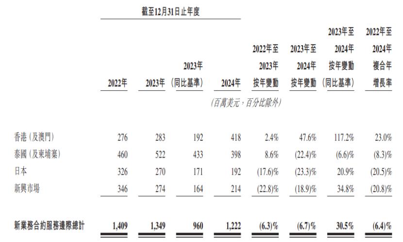 值得注意的是,分地區來看,2022年至2024年,富衛集團在中國香港及澳門的新業務合約服務邊際復合年增長率為23%,而在泰國及柬埔寨、日本、新興市場新業務合約服務邊際復合年增長率分別為-8.3%、-20.5%、-20.8%。