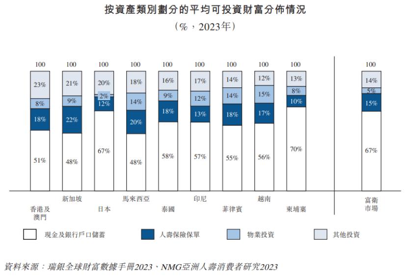 目前,富衛市場中可投資財富的很大部分都為現金及銀行儲蓄,平均占2023年可投資財富總額的67%。隨著這些地區平均收入及儲蓄的增加,保險公司有很大潛力可讓客戶分配更多可投資財富到人壽保單上。