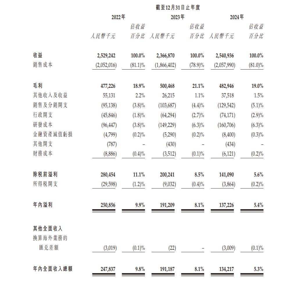 業績方面,招股書顯示,2022年、2023年及2024年,華曦達營收分別為25.29億元、23.67億元及25.41億元;毛利分別為4.77億元、5億元及4.83億元;年內溢利分別為2.51億元、1.91億元及1.37億元。