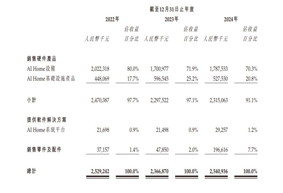 其中,2022年、2023年及2024年,來自AI Home設備收入分別為20.22億元、17.01億元及17.88億元,占總營收比例分別為80%、71.9%及70.3%;來自AI Home基礎設施產品的收入分別為4.48億元、5.97億元及5.28億元,占總營收的比例分別為17.7%、25.2%及20.8%。