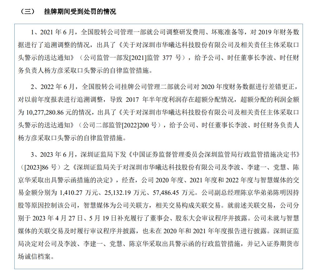 招股書顯示,2022年6月,華曦達及兩名時任高管因截至2017年半年報的綜合財務報表的一項會計錯誤,涉及收益、銷售成本、開支及純利等多項數據調整,因此導致截至2017年上半年超額分派溢利1027.73萬元,因此收到全國中小企業股份轉讓系統的口頭警告。
