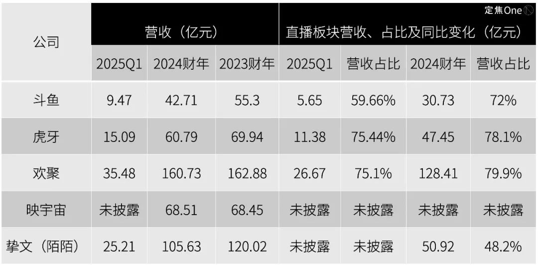 2025年Q1,也延續了這一趨勢,斗魚、虎牙、歡聚的直播營收占比分別為約60%、75%、75%,而摯文從2025年Q1起將直播服務與增值服務合并為“增值服務”,不再單獨披露。