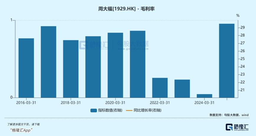 2024年,老鳳祥毛利率只有8.9%,中國黃金毛利率更是低至4.3%,而周大福的毛利率卻在2025財年同比增長5.5個百分點至29.5%,僅次于如今金店“一哥”老鋪黃金的41.2%。