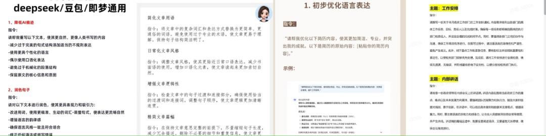 事實上,除了P圖有指令,當代年輕人的收藏夾里其實早已擠滿了各類工作指令,其中包括文本潤色指令,比如“請對一下文本進行潤色,改進用詞,使用更精準、生動的詞匯;調整句式,使表達更流暢自然;增強語言的韻律感”;也包括改簡歷的指令,比如“請幫我優化一下簡歷內容,使其更加簡潔、專業,并突出我的成就”;此外,還有許多與領導發言稿、日程安排表等工作相關的內容指令。