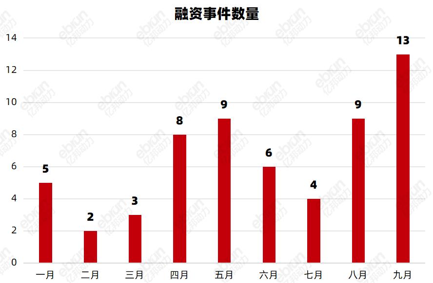 按照融資時間劃分,其中,第一季度發生10起融資、第二季度發生23起融資、第三季度發生26起融資,整體呈現出波動上升的行業趨勢;而9月則是投融資發生的高峰時期,一個月內發生了13起融資事件。