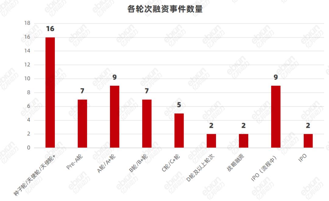 具體而言,種子輪/天使輪/天使輪+共計16起,Pre-A輪/A輪/A+輪共計16起,B輪/B+輪共計7起,C輪/C+輪共計5起,其他更高輪次的融資共計2起,戰略融資共計2起,處于IPO流程中的項目共計9起,IPO成功上市融資共計2起。其中,成長期企業(Pre-A輪、A輪、B輪和C輪)的融資事件占比約50%。
