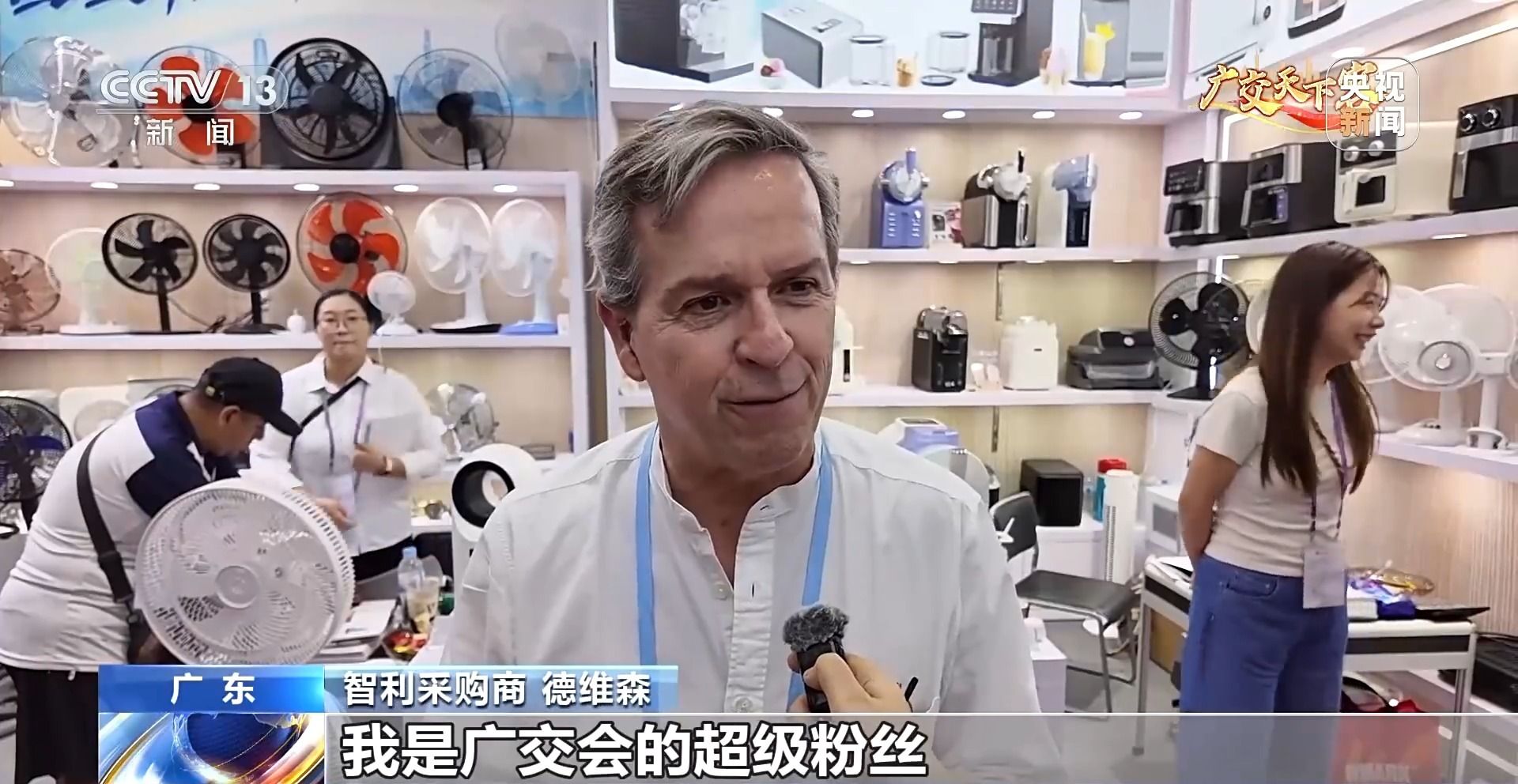 智利采購商 德維森:我是廣交會的超級粉絲,我非常佩服中國企業的創新能力,每年我都能找到很多新產品,我們公司每年購買大約四千萬到四千五百萬美元。