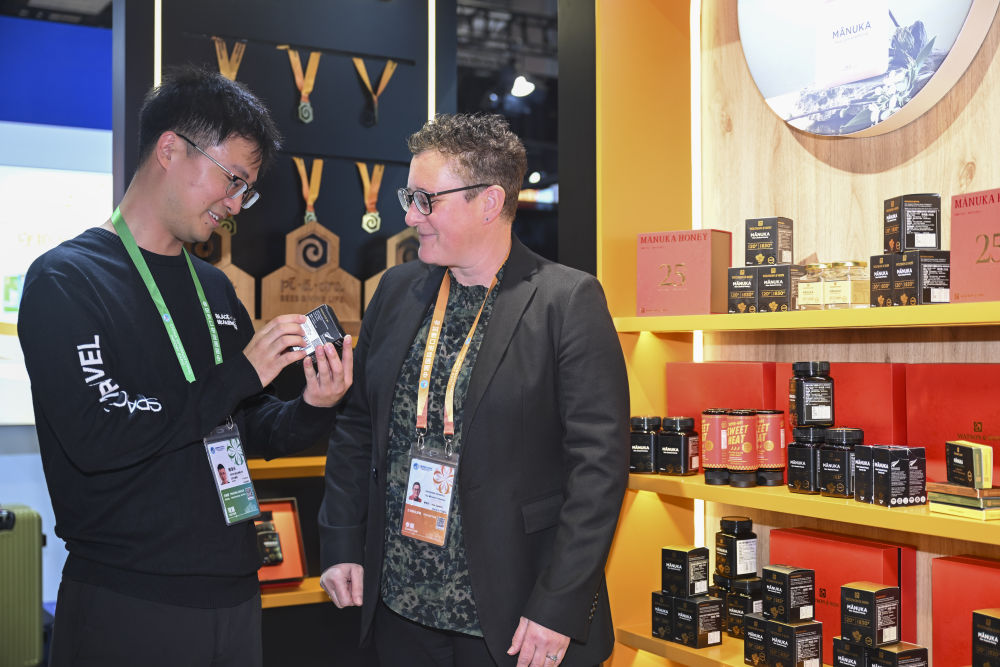 11月6日,在第八屆進博會農食產品展區一家新西蘭蜂蜜品牌展臺,參展商(右)向觀眾介紹蜂蜜產品。新華社記者 陳浩明 攝Ve3速刷資訊——每天刷點最新資訊,了解這個世界多一點SUSHUAPOS.COM