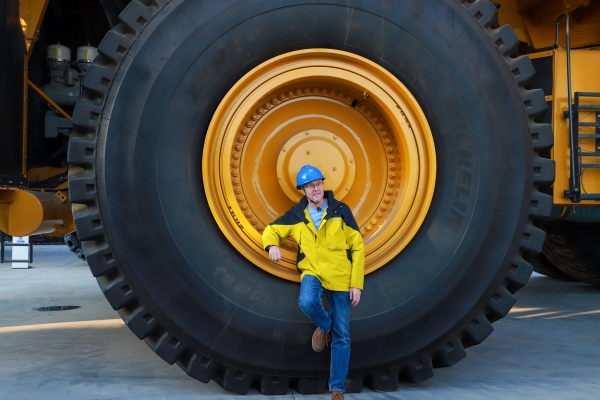 外籍視頻博主在徐工集團巨型起重機械的車輪前合影