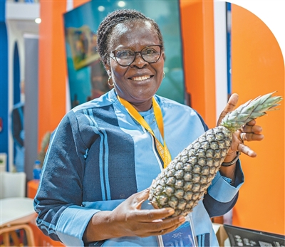 在第八屆進(jìn)博會(huì)國(guó)家綜合展上,貝寧國(guó)家館的工作人員展示貝寧奶油菠蘿。王 初攝(人民視覺(jué))