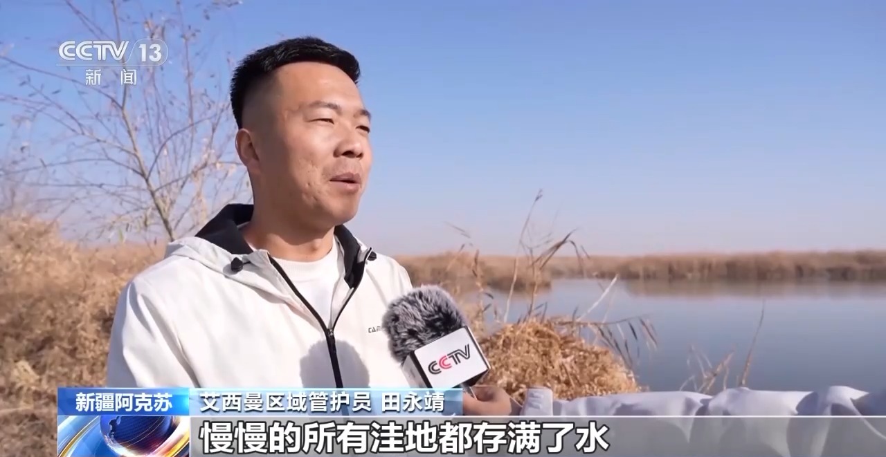 艾西曼區域管護員 田永靖:再生水過來之后,慢慢所有洼地都存滿了水,變成了現在所看到的濕地,這一大片的蘆葦現在長勢都特別不錯。