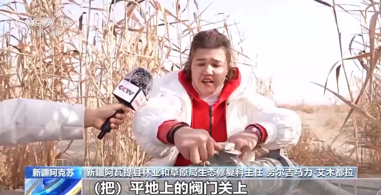 新疆阿瓦提縣林業和草原局生態修復科主任 努爾吉馬力·艾木都拉:把平地上的閥門關上,然后把全部壓力給到高處沙包上的滴灌管道。再生水來了,水源充足以后,現在成活率達到75%以上了。
